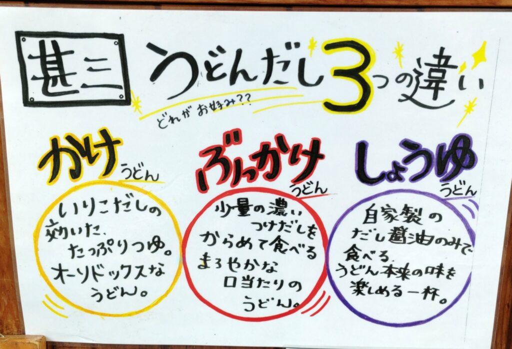 甚三うどんには、「かけ」「ぶっかけ」「しょうゆ」の3種類のうどんがあります。店内に掲示されていた説明がとてもわかりやすかったので、ご紹介しますね。