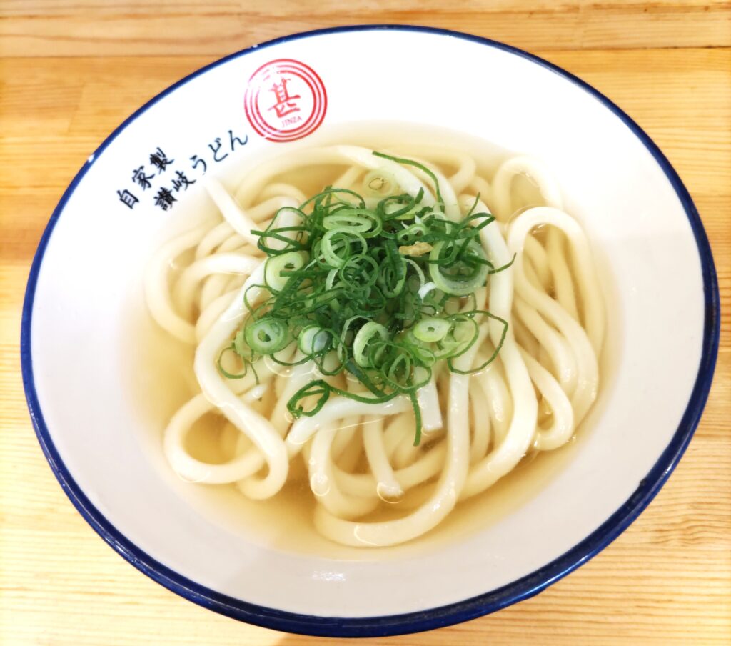 白いどんぶりに「自家製讃岐うどん」「甚」のロゴ。うどんの上にはたっぷりの刻みネギ。見た目はとてもシンプルです。