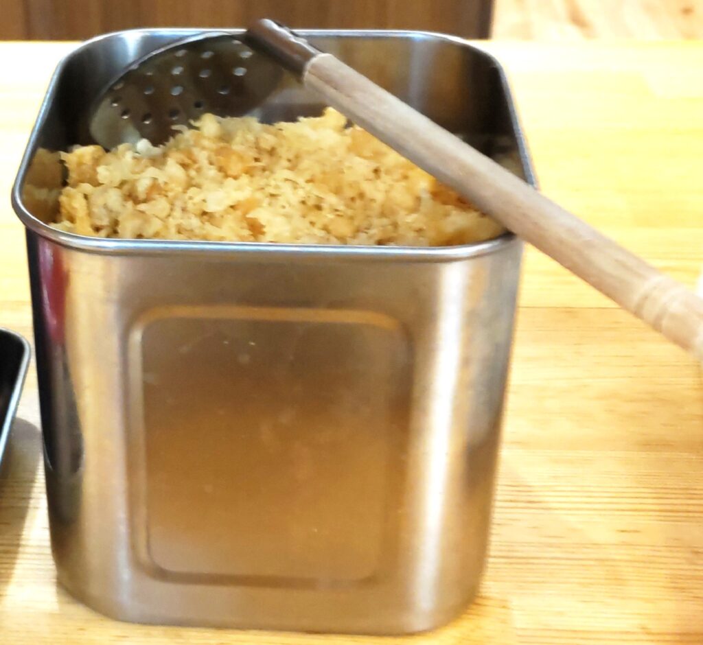 セルフで追加できるトッピングは天かすです。揚げ玉とも言いますね。金属の容器にたっぷり入っていて、好きなだけ入れられます。私も少し散らしてみました。