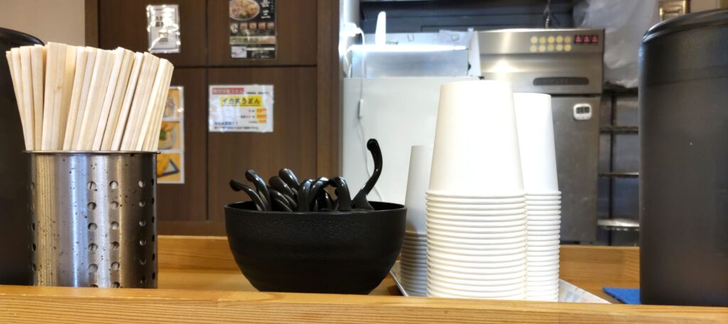 割り箸とレンゲ、水用のコップがセルフで置いてあります。水はセルフサービスで、自分で注ぐスタイル。シンプルで気軽な雰囲気が、サラリーマンのお昼休みにぴったりだなと感じました。