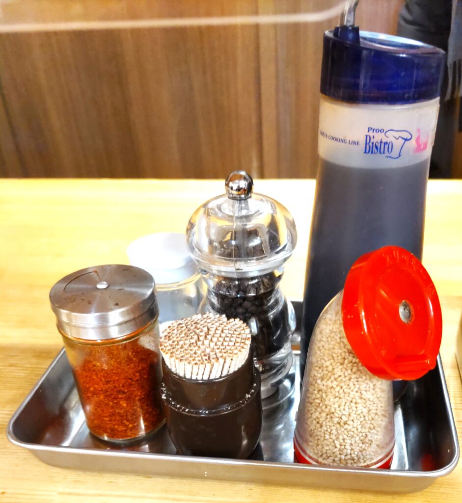 一味唐辛子、白ごま、ブラックペッパー、醤油などが並んでいます。一味唐辛子は、先ほどの掲示にあった香川県・山清の唐辛子を使っているそう。調味料までこだわっているのは、さすがです。