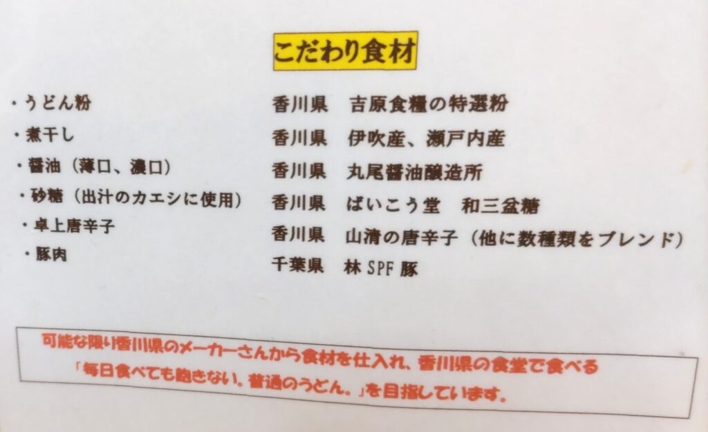 掲示を見ると、うどん粉は香川県・吉原食糧の特選粉、煮干しは香川県・伊吹産と瀬戸内産、醤油は香川県・丸尾醤油醸造所のもの。さらに、砂糖は香川県・ばいこう堂の和三盆糖、卓上唐辛子は香川県・山清の唐辛子をブレンドしたものだそうです。