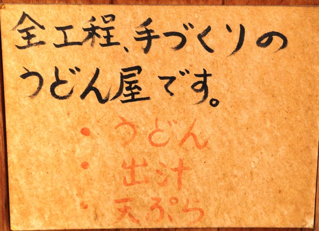 「全工程、手づくりのうどん屋です。」と書かれています。うどん、出汁、天ぷら、すべてお店で手づくりしているとのこと。この一文を見て、期待がさらに高まりました。