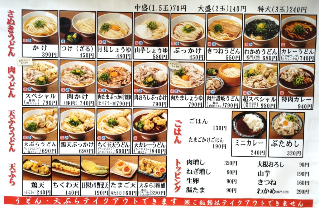 上段には「温かい讃岐うどん」と「冷たい讃岐うどん」が並んでいます。かけうどんは390円。中段には肉うどんや天ぷらうどん、下段には天ぷら単品やトッピング、ごはん類があります。