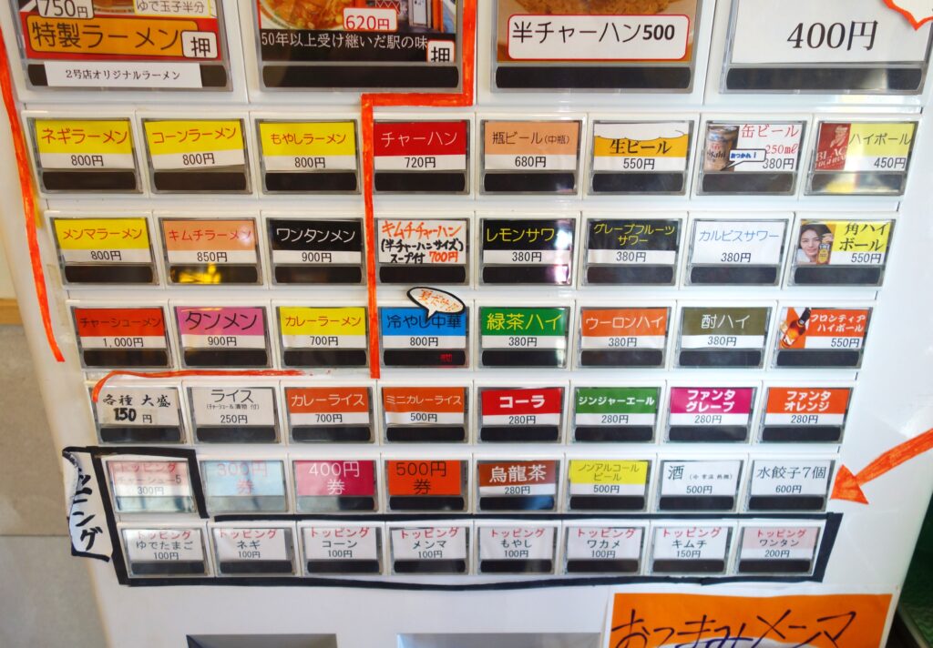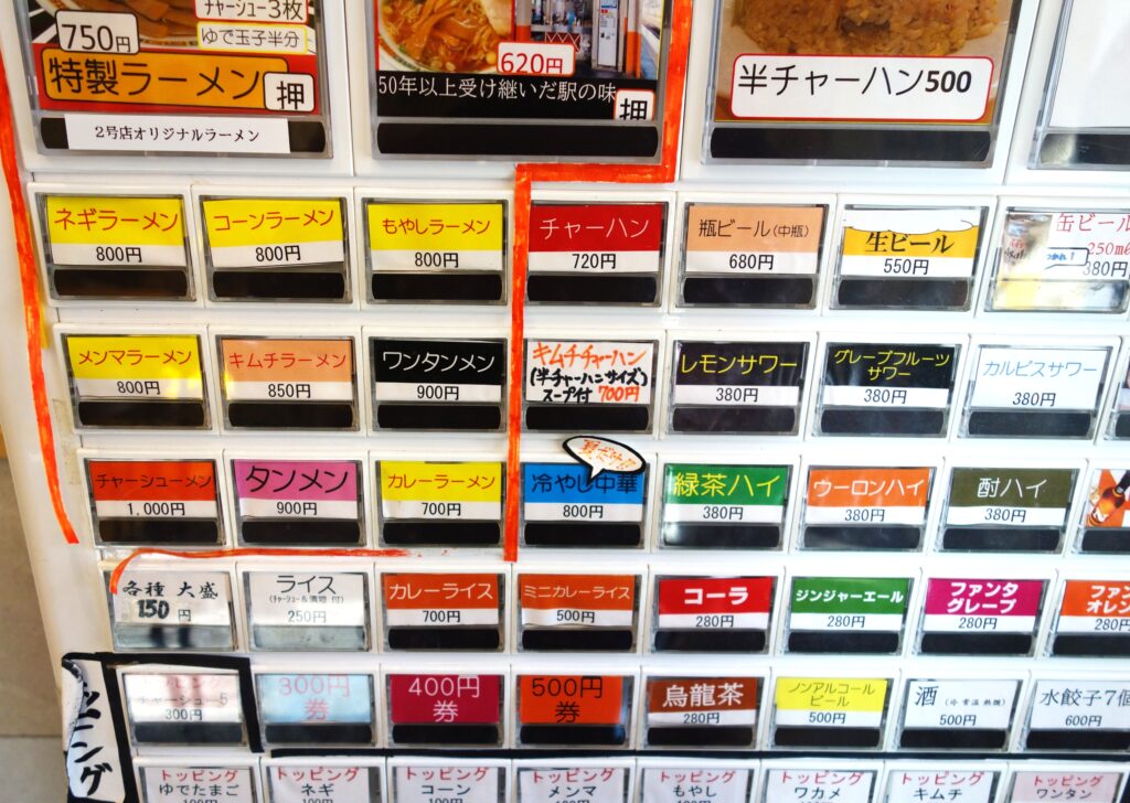 券売機の上段。特製ラーメン750円、ステーションラーメン620円など