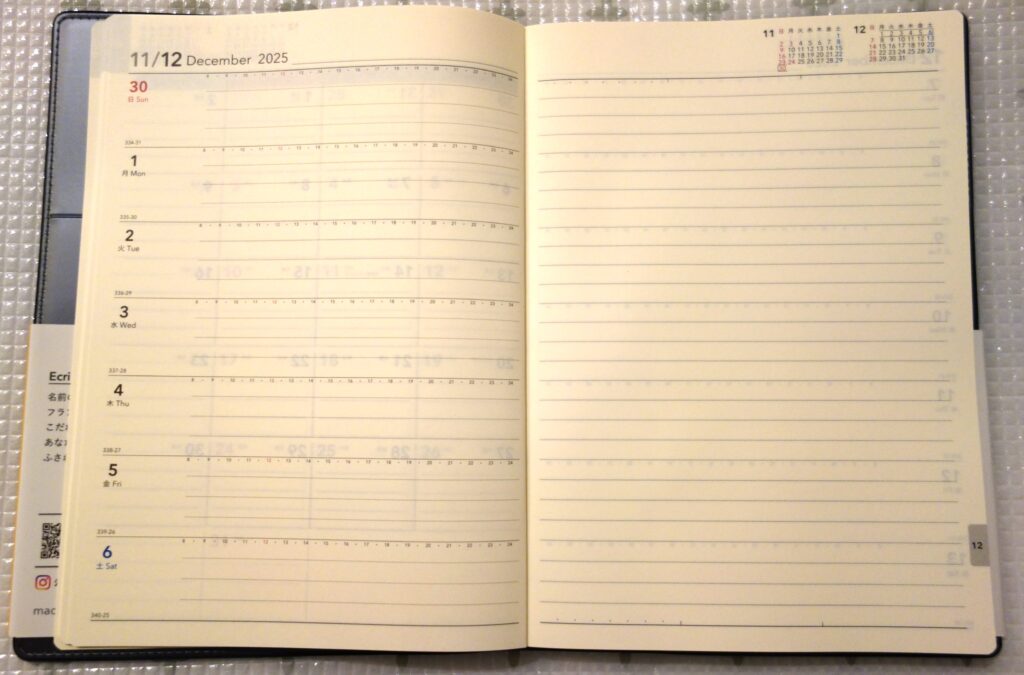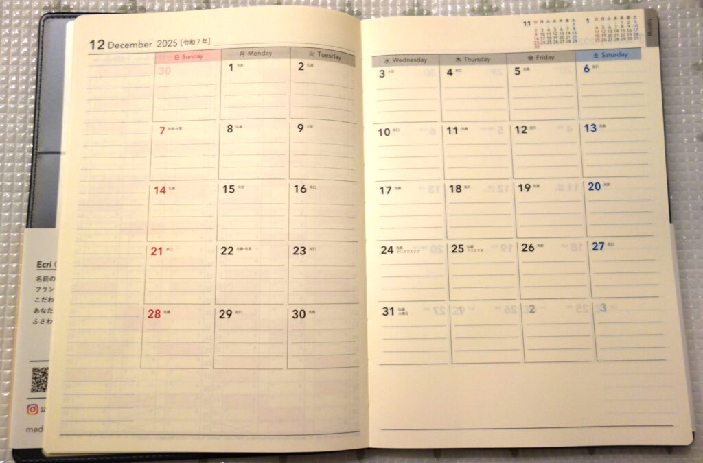 この手帳は2025年12月から使えるタイプです。「2026年1月始まり」ではないので、ご注意ください。