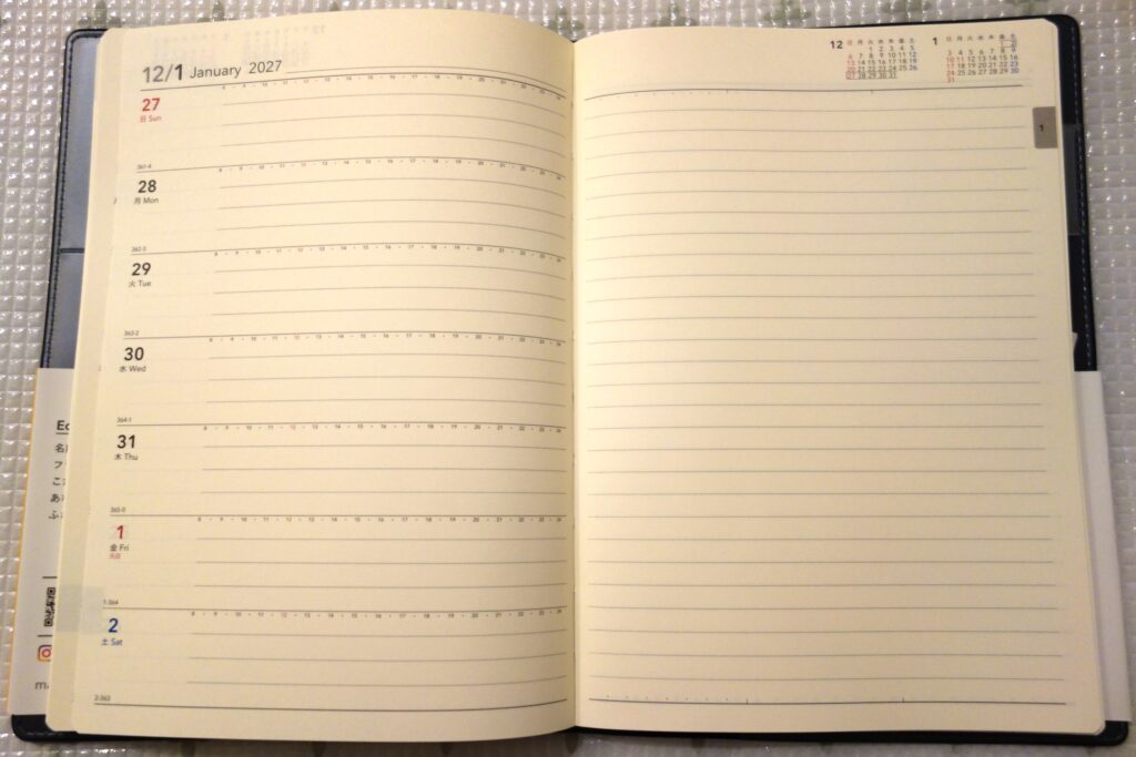 ただし、月間ページは2027年1月まで、週間ページは2026年12月末まで掲載されているので、2月や3月から使い始めても、年末までたっぷり使えます。