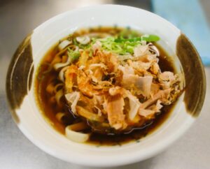 さらに驚いたのが、刻んだベーコンが入っていること。駅そばにベーコンというのは意外な組み合わせですが、これが絶妙なんです。ベーコンから溶け出す油が辛いつゆに混ざり合い、コクが一段と増します。辛さ・甘さ・脂のうまみが三位一体となって、最後の一滴まで飲み干したくなるつゆに仕上がっています。